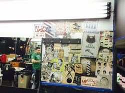 The exisiting shop started with standard white walls, white drop ceiling with flourecent lighting and white tile floor. We transformed the space into a one of kind shop with custom made vintage posters wallpapering the walls and ceiling, the remaining walls were painted with a rich black paint; 2 sections of which are chalk board paint.